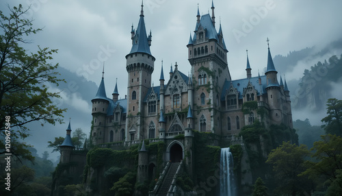 castle, fairy tale, mediaeval, turret, church steeple, stone wall, misty, fog, moody, atmospheric, mysterious, waterfall, overgrown, vine, tree, forest, grey, blue, green, evening, dusk, romanticism, fortress, stronghold, magic, enchantment, secret, hidden, ancient, old world, european, grandeur, imposing, picturesque, scenic, nature, wilderness