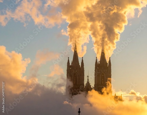 cathedral, gothic, architecture, fog, sunset, cloud, steam, tower, gold, light, atmosphere, mystical, religious, building, stone, church steeple, orange, yellow, blue, sky, dawn, mist, heavenly, spiritual, winter, cold, morning, evening, scenic, view, landscape, travel, photo, image, picture, photo, europa, historic, historical, religion, faith, belief, hope, serene, tranquil, calm
