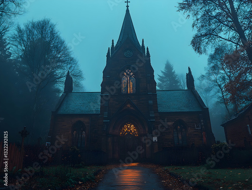 church, gothic, mist, fog, dark, light, architecture, building, historic, ancient, mediaeval, stone, exterior, chapels, religion, faith, spiritual, gloomy, creepy, skittish, night, tree, wood, landscape, autumn, foggy, morning, evening, silhouette, window, door, path, grass, leaf, religious, structure, illuminated, view, grey, blue, tranquil, peaceful, serene, still, mystery, enchanted, haunted, silent, old