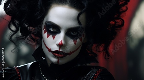 gothic, clown, make-up, dark, eye, red, lip, portrait, dramatic, costume, halloween, moody, mysterious, creepy, skittish, theatrical, beauty, fashion, style, model, face, expression, intense, bold, striking, surreal, eerie, haunting, sinister, grisly