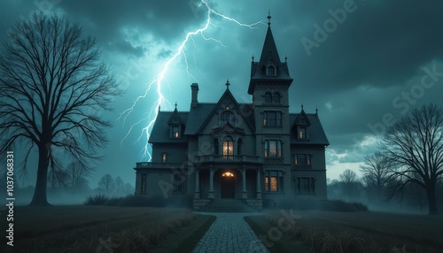 gothic, haunted, luxury home, stormy, sky, lightning, strike, eerie, skittish, dark, atmospheric, supernatural, ominous, desolate, shadowy, cloud, chilling, storm, ruin, thunder, abandoned, paranormal