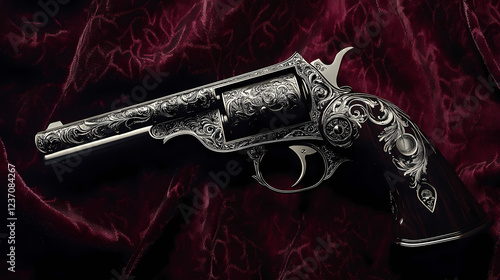 Gothic-inspired pistol with intricate dark engravings on a velvet backdrop, capturing the eerie, refined elegance of gothic weaponry, symbolizing mystery and tradition. Gothic Elegance. Illustration