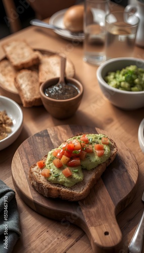 Gourmet Avocado Toast Topped with Fresh Tomatoes and Microgreens on Artisan Sourdough Bread, Accompanied by Guacamole and Crusty Bread in a Rustic Brunch Café, Ideal for Food blogs and recipe websites