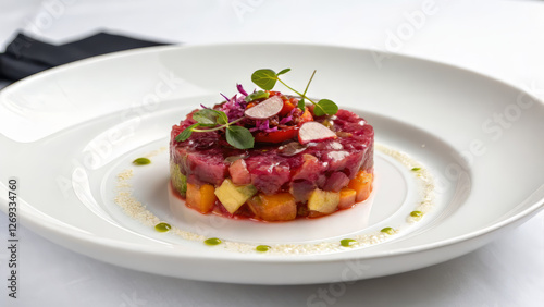 Gourmet beef tartare with colorful vegetables and microgreens