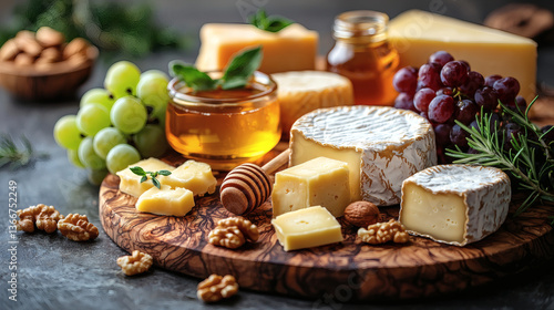 Gourmet Cheese Board with Honey, Nuts, and Grapes – Premium Food Photography