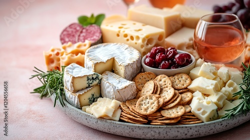 Gourmet Cheese Board with Wine and Crackers: A delectable spread of various cheeses, crackers, and cranberry sauce, perfect for a sophisticated gathering.