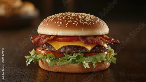 epicure, cheeseburger, lettuce, tomatoes, bacon, cheese, hamburger, sandwich, food, delicious, meal, lunch, dinner, snack, bar-b-q, fast food, ingredient, kitchen, culinary, grill, beef, sesame, fresh, flavorful, comfort, serving, presentation, rustic, wooden, table, closeup, appetising, eatery, take-away, picnic, gourmet food, crispy, savoury, classic, receipe, indulgence, hearty, homemade, dining, bite, juicy, meaty