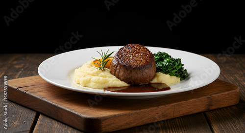 Gourmet Delight: Savor the succulent taste of a perfectly cooked steak, paired with creamy mashed potatoes, fresh spinach, and a drizzle of savory sauce.