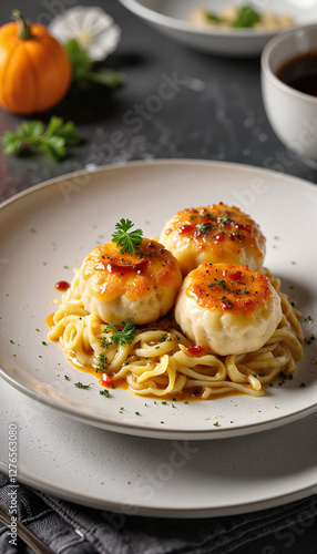 Gourmet Gołąbki plated elegantly on noodles, culinary artistry