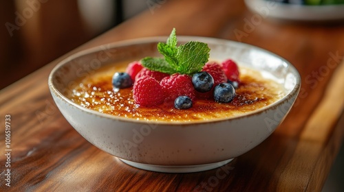 Gourmet in a bowl, decorated with fresh raspberries, blueberries, and mint, displayed on a wooden table. Close-up shot highlighting the dessert's elegance.