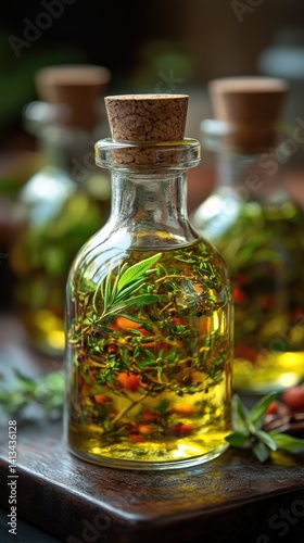 Gourmet oil: herbal aroma, Mediterranean tradition, golden extract, culinary accent, infused harmony, rich taste, exquisite essence, delicate seasoning, aromatic delight, premium ingredient.