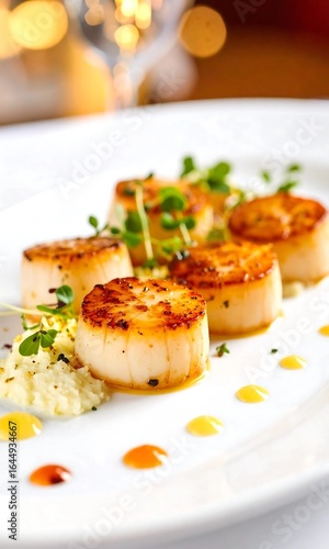 Gourmet pan-seared scallops served on a white plate with smooth puree and fresh herb garnish, fine dining close-up showcasing elegant plating and culinary artistry