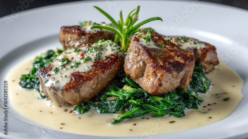 Gourmet plate of veal medallions with a cream sauce and sauted spinach, isolated on a white background