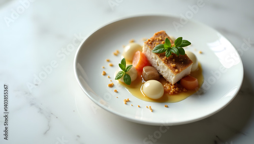 Gourmet plated fish fillet with vegetables and sauce on white plate