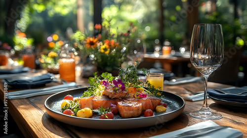 salad, wine glass, elegant, grape, mango, colourful, vegetable, fish, culinary, food photography, main course, accessing, health food, garnish, setting, cookery, ambience, fresh, natural light, food, seafood, plate, epicure, meal, table, flower, eatery, celebration, atmosphere, bokeh, lunch, special occasion, salmon, delicious, summer, tomatoes, wooden table, fruit, dinner, wine, vibrant, presentation, fine dining