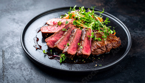 beef, steak, epicure, sliced, garnish, fancy, presentation, tender, quality, feast, dining, luxury, accessing, flavorful, nourishment, platter, indulgence, reduction, aged, premium, herb, serving, elegant, sirloin, taste, plated, tenderloin, menu, ribeye, protein, fare, marbled, carrot, relish, red, savoury, deliciously, succulent, healthy, black, juicy, beefsteak, dark, fillet, delicacy, gastronomy, butchering, chef, grilled