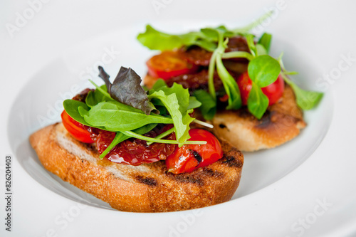 bruschetta, cherry tomato, fresh, healthy, white plate, food, cookery, snack, tomatoes, greener, mixed salad, vegetarian, light meal, colourful, vibrant, closeup, culinary, food photography
