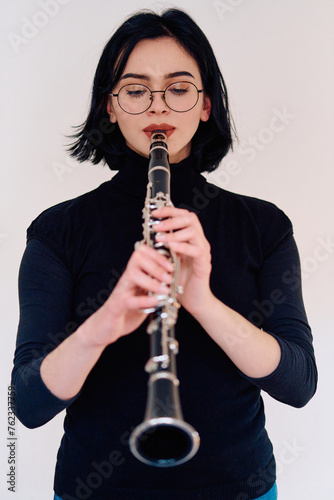 Graceful Brunette Musician Posing with Clarinet on White Background