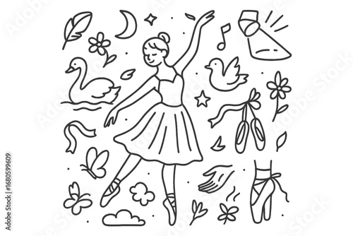 graceful, doodle, montage, hand, drawn, illustration, grace, ballet, dancer, flowing, dress, cygnet, feather, flower, moon, star, ribbon, music, note, spotlight, tutu, shoe, gesture, soft, cloud, butterfly, simple