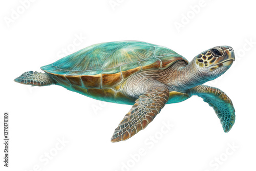 Graceful sea turtle swimming, vibrant green and blue hues, marine life theme, ideal for ocean conservation awareness. Isolated on white background or PNG