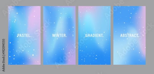 Gradient Pastel Winter Background. Iridescent aura posters. Set of trendy Neon banners for social media. Minimal blur wallpaper with snowflakes. Trendy Vector illustration.
