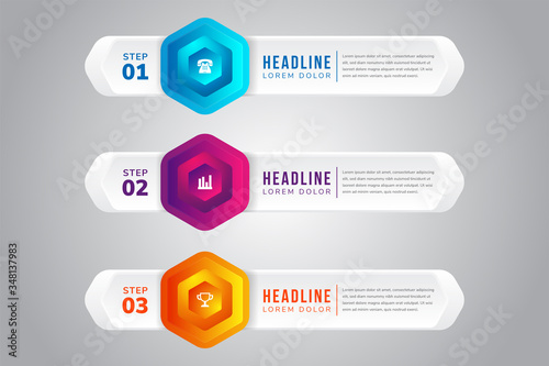 gradient vector illustration. Infographic template with three elements, hexagon, rectangle. Timeline step by step. Designed for business, presentations, web design, diagrams, training with 3 steps.