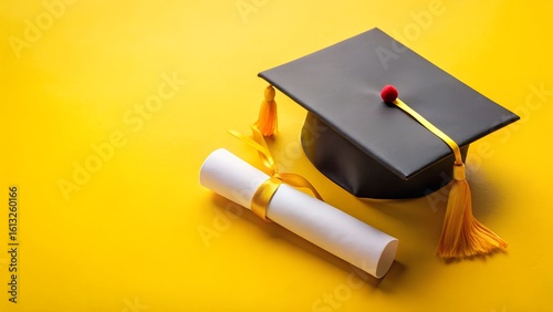 graduation, cap, diploma, scroll, degree, education, success, achievement, celebration, academic, mortarboard, tassel, certificate, cognition, learning, study, college, university, student, future, career, accomplishment, symbol, yellow, black, white