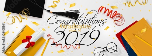 Graduation vector banner. Background Congrats graduates with objects viewed from above hat with degree paper, books, notebook and pencil, glasses, gold confetti, ribbons and stars.