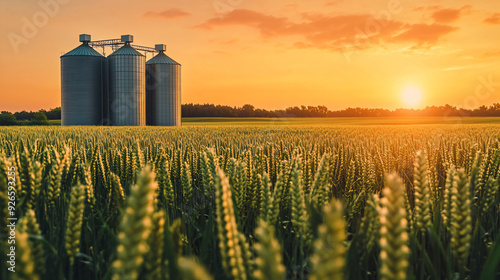 grain, silos, wheatfield, wheat, agriculture, farming, farm, sunset, golden hour, rural, countryside, landscape, nature, sky, cloud, horizon, summer, harvest, crop, field, farmland, agricultural, gold, light, warm, sun, ray, evening, twilight, dramatic, scenic, beautiful, serene, peaceful, tranquil, outdoors, green, yellow, brown, orange, red, industry, food
