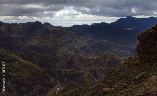 Gran Canaria, landscape of the central part of the island, Las Cumbres, ie The Summits, short hike between rock Formation Chimirique and iconic Roque Nublo