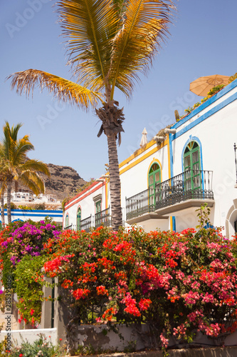 Gran Canaria, Spain - Typical architecture of Puerto de Mogan, a small fishing port of Gran Canaria. Colorfull flowers blooming around houses.