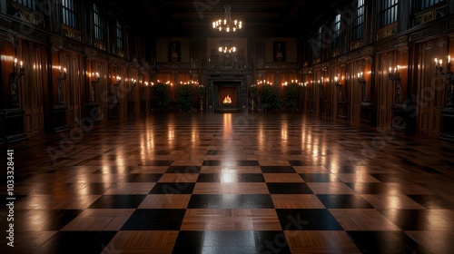 Grand Ballroom with Checkerboard Floor Fireplace and Chandelier