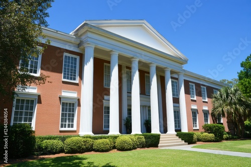 building, architecture, classical, column, redbrick, hedge, landscaping, sunny day, clear sky, majestic, grand, prestige, history, institution, university, government building, exterior, facades, structure, design, estate, luxury home, house