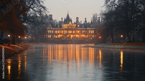 luxury home, water, building, architecture, light, tree, autumn, dusk, evening, serene, tranquil, ornate, grandeur, historic, elegance, landscape, facades, structure, intricate, classic, picturesque, symmetric, illuminated, detailed, majestic, sombre, stillness, calm, beauty, nature, outdoors, park, canal, peaceful, muted, gold, sky, overcast, dark, twilight, gothic, river, scenic, vista, environment, atmosphere, cold