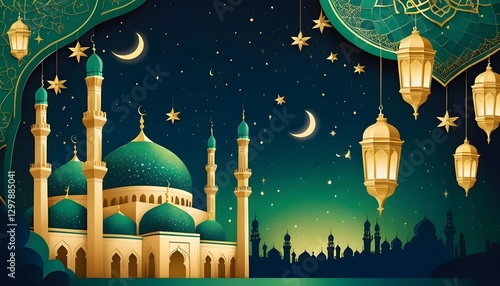 mosque, islam, ramadan, night, lantern, crescent moon, star, glowing, architecture, building, religion, culture, celebration, holy, faith, spiritual, traditional, background, design, art, illustration, graphic, digital artwork, vector, eid, muslim, arabic, middle east, oriental, decorative, ornamental, pattern, silhouette, greeting card, poster, banner, website, holiday, festive