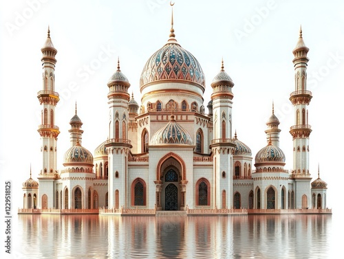 Grand mosque with reflection, isolated on white, perfect for architectural renders