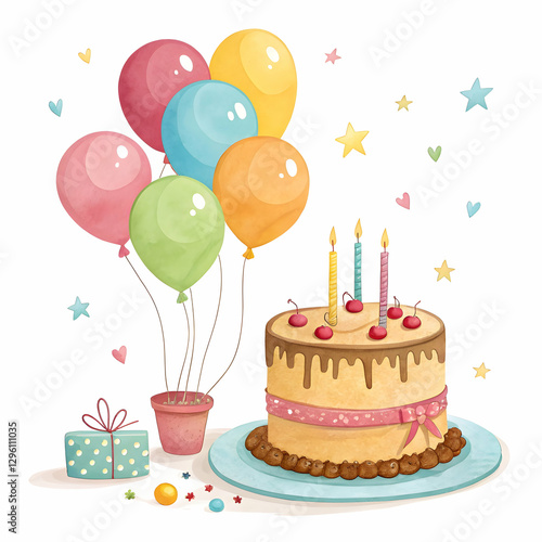 grand multi-tiered birthday cake adorned with colorful frosting and glowing candles, surrounded by vibrant helium balloons for a festive celebration