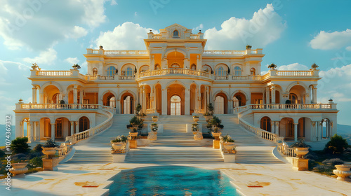 ornate, garden, summer, dream, architecture, luxury, beautiful, building, illustration, fantasy, balcony, step, house, stone, design, elegant, landscape, home, classical, pool, cloud, exterior, window, nature, majestic, opulent, grand, palace, sky, luxury home, column