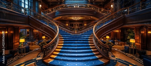 staircase, grand, interior, luxury, architecture, design, wood, blue, carpet, stair, elegant, classic, formal, opulent, ornate, gilded, luxury home, palace, hotel, building, house, home, royals, historic, antique, rich, decor, furniture, lighting, chandelier, brass, metal, railing, balustrade, balcony, pattern, geometric, symmetry, perspective, antechamber, hallway, lobby, room, wide, angle