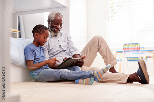 Grandfather Sitting With Grandson In Childs Bedroom Using Digital Tablet Together