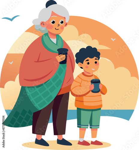 grandmother, grandson, together, family, outdoors, drink, hot, sunset, illustration, cartoon, character, cute, happy, love, bond, warmth, scenic, landscape, nature, bird, sky, evening, relaxing, relaxation, friends, friendship, companionship, human relationships, generation, elderly, children, smile, smiling, comfort, adventure, clothes, hair, young, old, senior