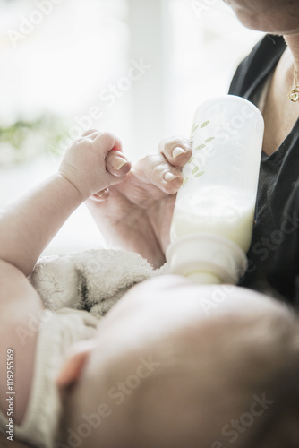 Grandmother bottle feeding baby