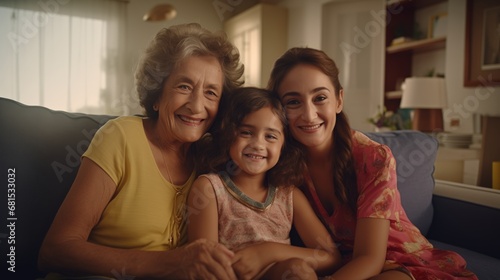 Grandmother, mom and child hug in a portrait for mothers day on a house sofa as a happy family in Colombia. Smile, Happy mother's day or mom day concept