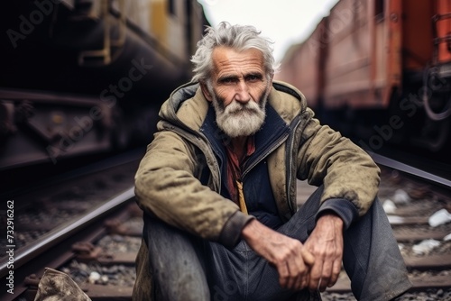 Grandpa sat on the abandoned railway station with a desperate expression,