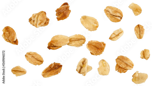 granola, oatmeal, flake, scattered, topview, roasted, grain, muesli, healthy, breakfast, dry, seed, cereal, food, ingredient, organic, diet, white, isolated, background, fiber, dessert, nourishment, meal, oat, product, top, view, agriculture, corn, tasty, culinary, crunchy