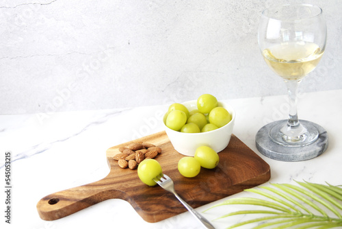 grape, wine, almond, green, fruit, fresh, food, healthy, glass, board, wood, wooden, closeup, leaf, ingredients, white, fork