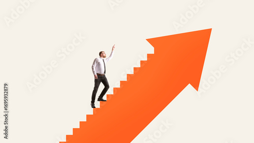Graphic composition. Businessman on staircase arrow pointing upward confidently . Concept of promotion, ambition, structured progress, leadership, and sustainable success.
