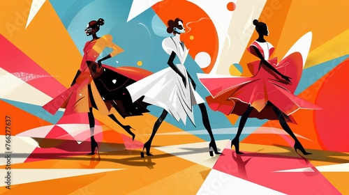 illustration, background, silhouette, high heel, fashion, dress, colourful, bright, art, primary colours, suit, graphic, minimalist, simplistic, haute couture, stylised, style, expressive, exaggerated, garment, design, dramatic, pose, walking, model, woman, vector, beauty, people, design, colours, black, clothing, person, clothes, lady, hair, cartoon, man, shoe, glamour, pattern, body, girl
