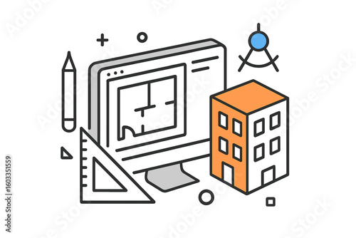 Graphic representation of architectural design tools and software illustrating building concepts