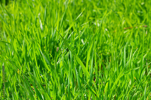 Grass close up with shallow depth of field. Grassy green decorative background.